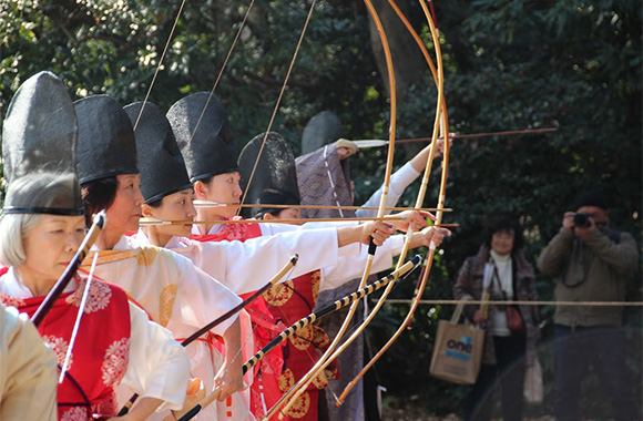 現在行われている百々手式は、射手数人が前弓・後弓に分かれ、